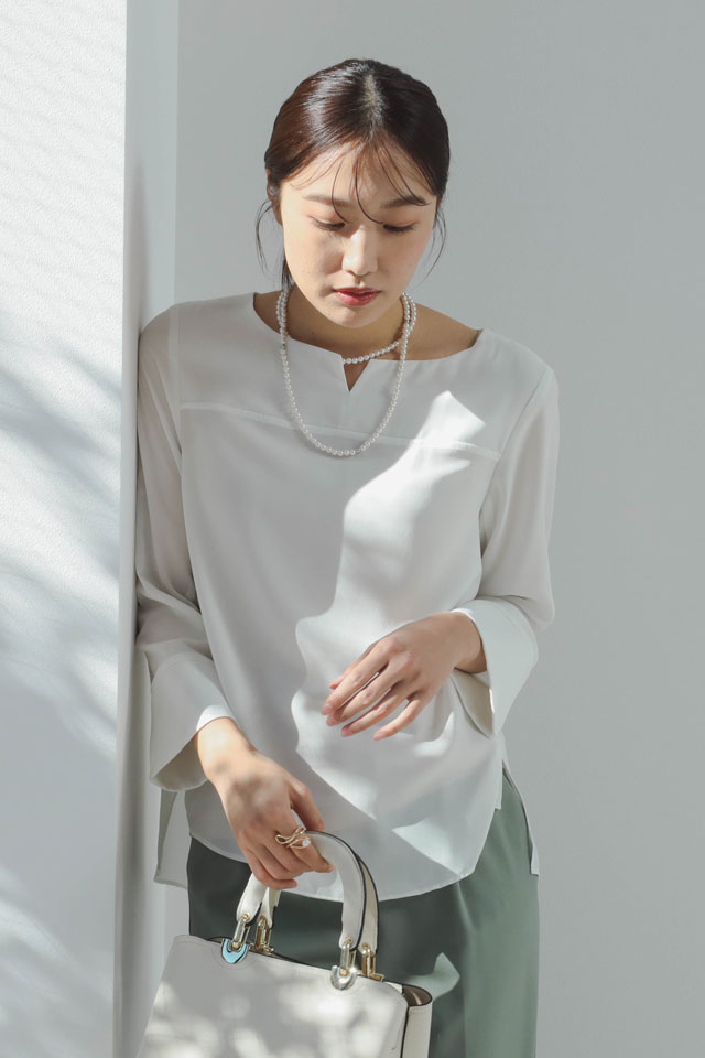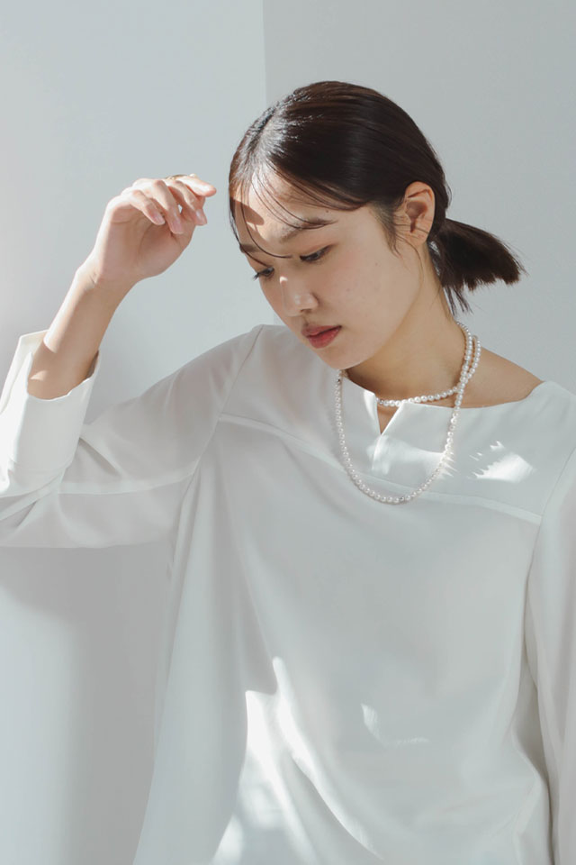 ボックスシルエットと比翼仕立てのフロントボタンがモードな印象のシャツブラウス。