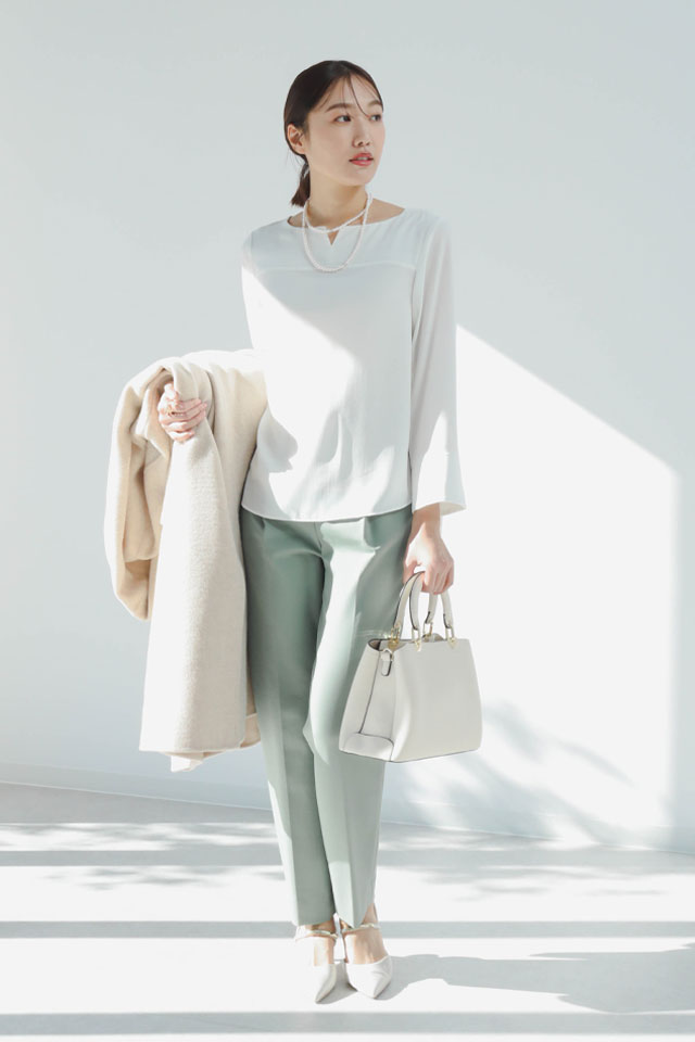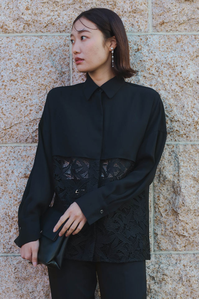 端正なレースの程よい肌見せが上品な抜け感を与えます。