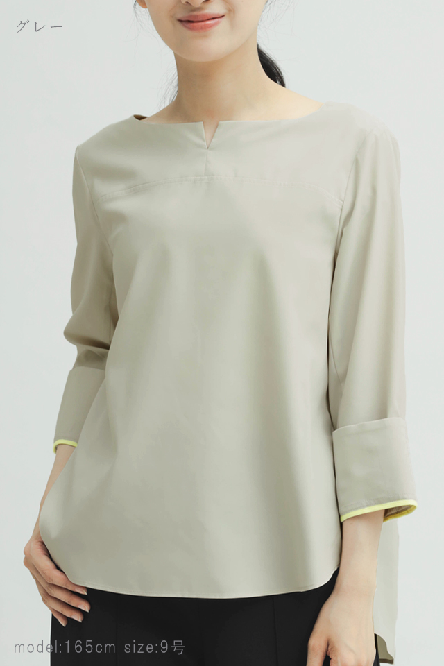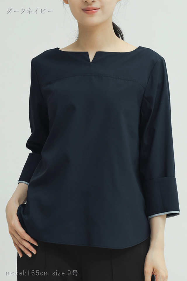 ジャケットのインナーとして着やすい、使い勝手を考えたキーネックブラウス。ターンバックにアレンジ可能なカフス部分で、お好みに合わせた様々なスタイリングをお楽しみいただけます。
