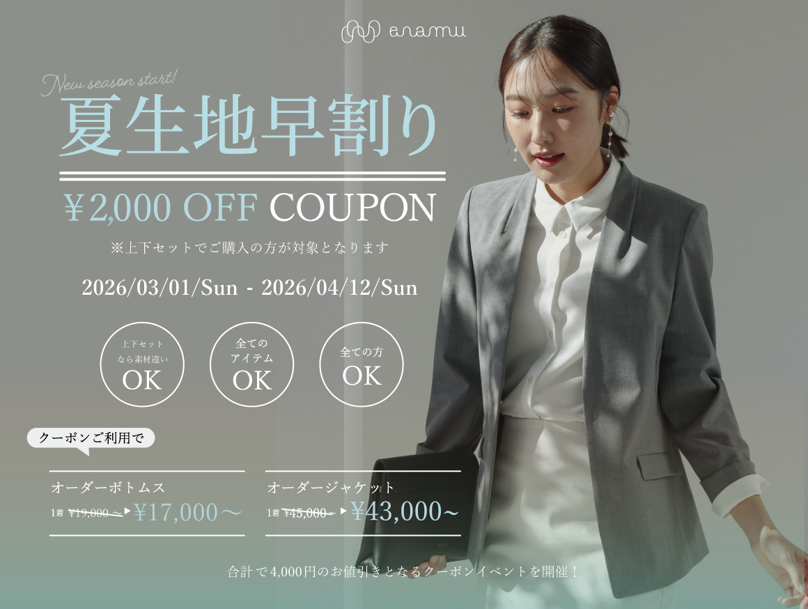 期間中に対象生地でオーダーアイテムを受注いただくと、2000円引きになるイベントを開催!